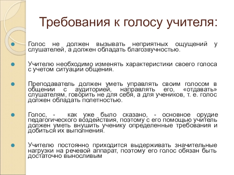 Учителю постоянно приходится выдерживать значительные нагрузки на речевой аппарат, поэтому его голос обязан быть достаточно выносливым
