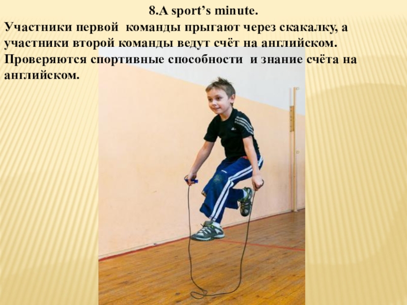 команды ведут счёт на английском. Проверяются спортивные способности и знание счёта на английском.