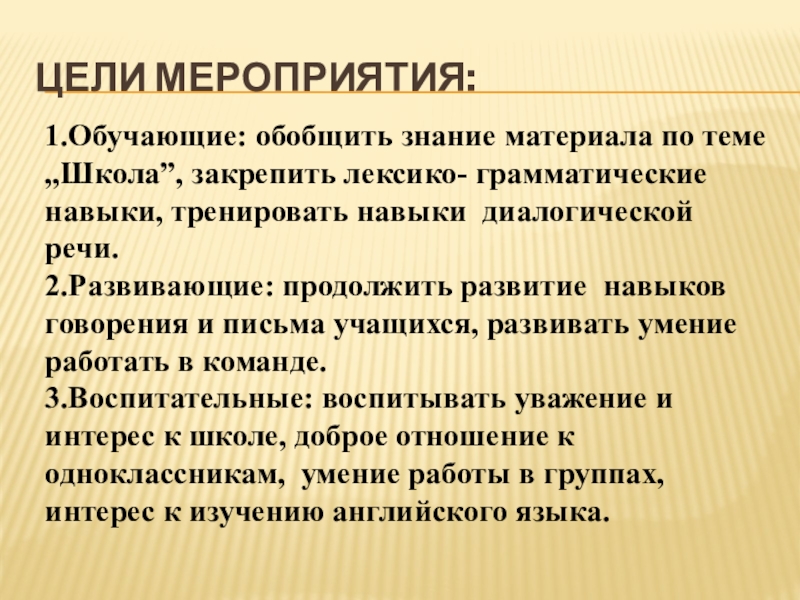 1.Обучающие: обобщить знание материала по теме ,,Школа”, закрепить лексико-