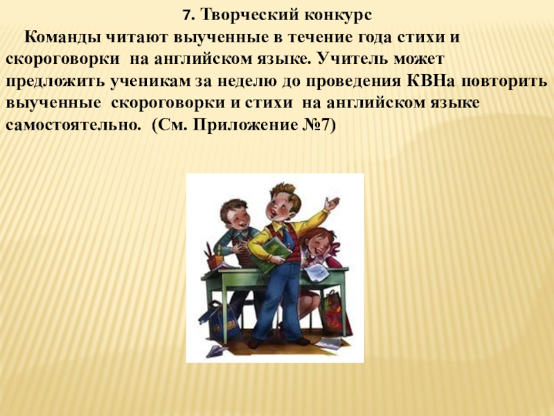 и скороговорки на английском языке. Учитель может предложить ученикам за неделю до проведения КВНа повторить выученные скороговорки и стихи на английском языке самостоятельно. (См. Приложение №7)