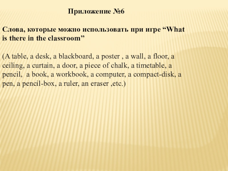 6. Now, let’s play for a while. Игра «What is there in the classroom?» Учащиеся тренируют конструкцию ‘’ There is…/there are…’’