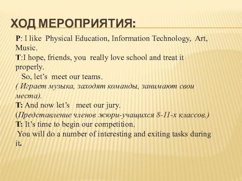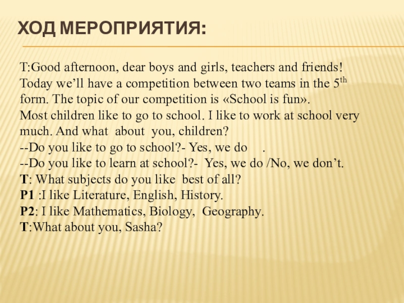 we’ll have a competition between two teams in the 5th form. The topic of our competition is «School is fun».
