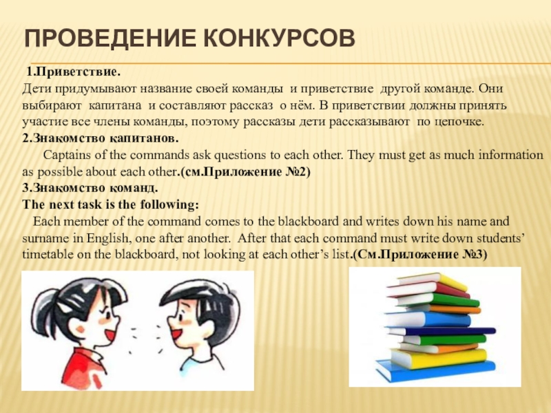 Captains of the commands ask questions to each other. They must get as much information as possible about each other.(см.Приложение №2)