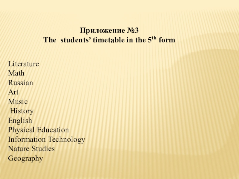 Each member of the command comes to the blackboard and writes down his name and surname in English, one after another. After that each command must write down students’ timetable on the blackboard, not looking at each other’s list.(См.Приложение №3)