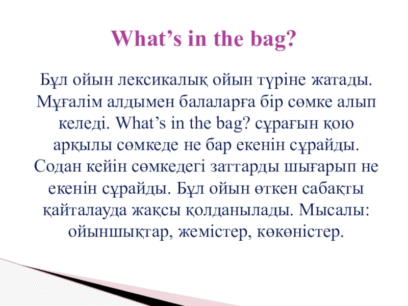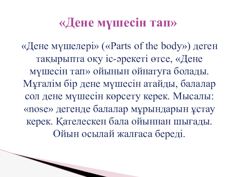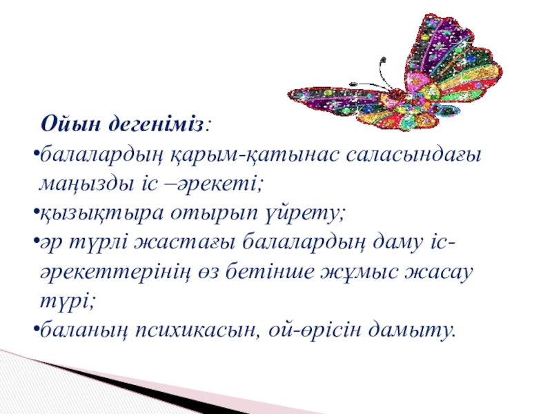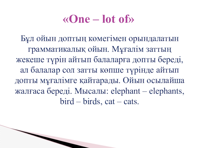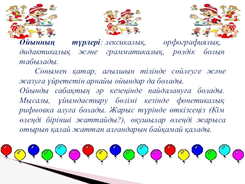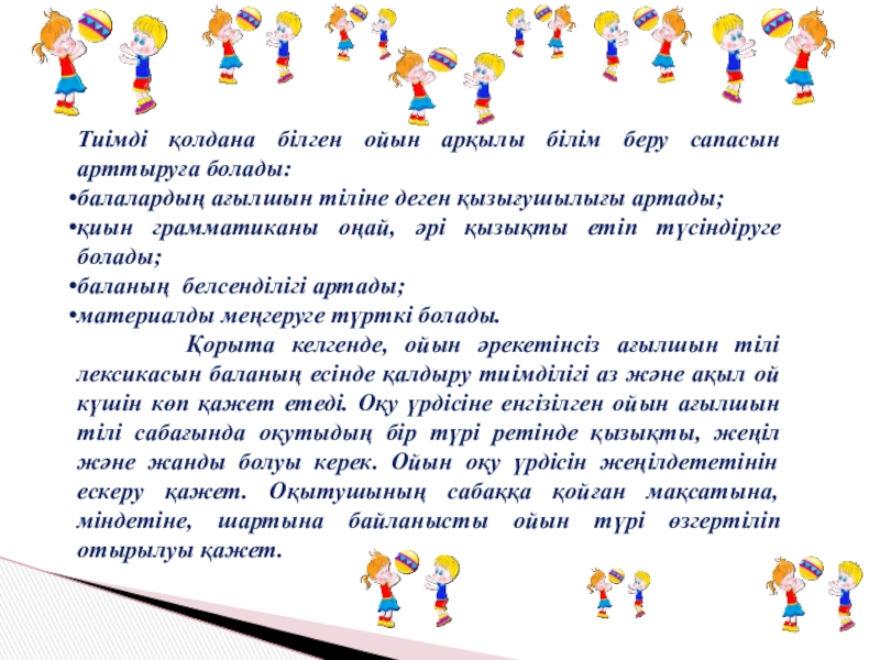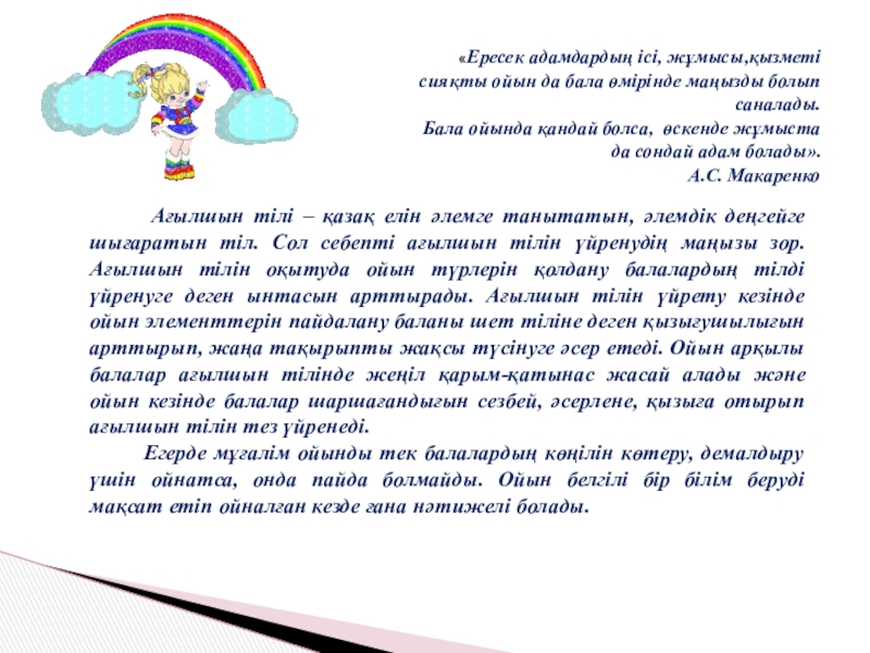 Ағылшын тілі – қазақ елін әлемге танытатын, әлемдік деңгейге шығаратын тіл. Сол себепті ағылшын тілін үйренудің маңызы зор. Ағылшын тілін оқытуда ойын түрлерін қолдану балалардың тілді үйренуге деген ынтасын арттырады. Ағылшын тілін үйрету кезінде ойын элементтерін пайдалану баланы шет тіліне деген қызығушылығын арттырып, жаңа тақырыпты жақсы түсінуге әсер етеді. Ойын арқылы балалар ағылшын тілінде жеңіл қарым-қатынас жасай алады және ойын кезінде балалар шаршағандығын сезбей, әсерлене, қызыға отырып ағылшын тілін тез үйренеді.