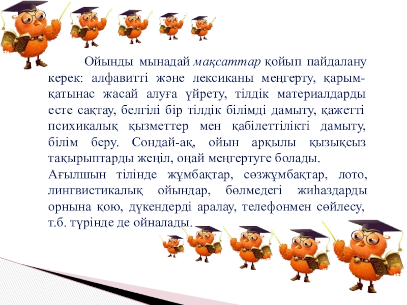 Егерде мұғалім ойынды тек балалардың көңілін көтеру, демалдыру үшін ойнатса, онда пайда болмайды. Ойын белгілі бір білім беруді мақсат етіп ойналған кезде ғана нәтижелі болады.
