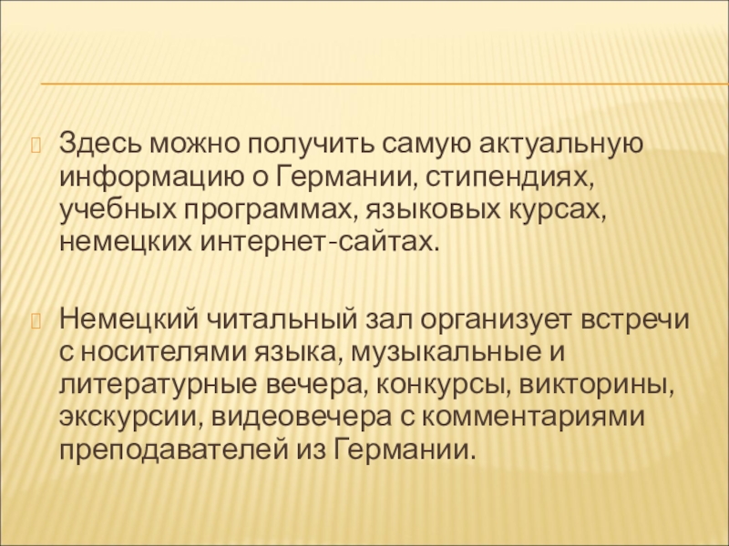 Немецкий читальный зал организует встречи с носителями языка, музыкальные и литературные вечера, конкурсы, викторины, экскурсии, видеовечера с комментариями преподавателей из Германии.