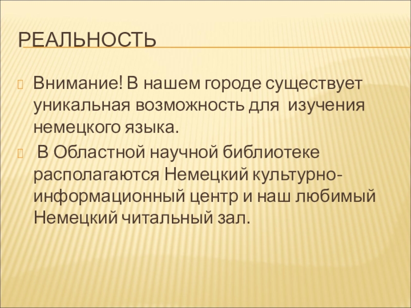РЕАЛЬНОСТЬВнимание! В нашем городе существует уникальная возможность для изучения немецкого языка. В Областной научной библиотеке располагаются Немецкий