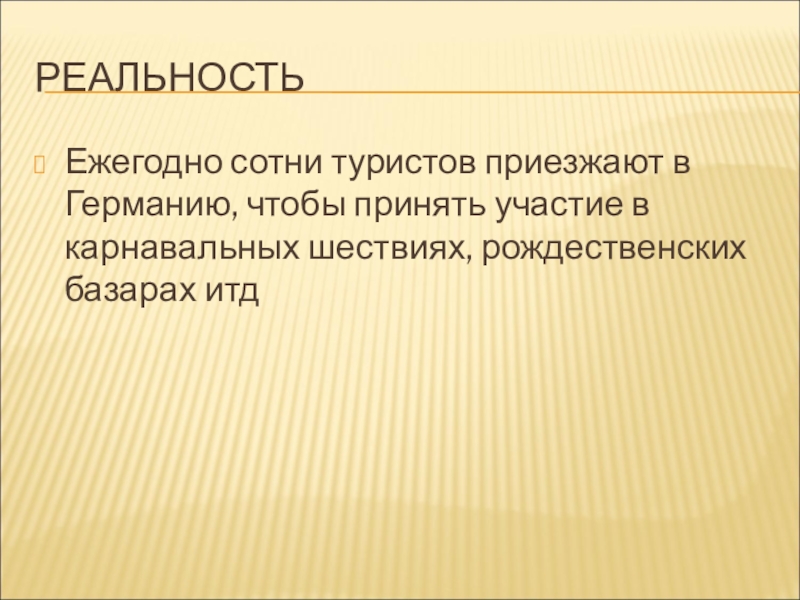 РЕАЛЬНОСТЬЕжегодно сотни туристов приезжают в Германию, чтобы принять участие в карнавальных шествиях, рождественских базарах итд