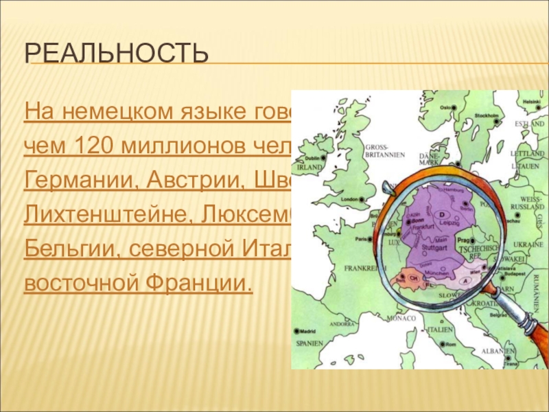 РЕАЛЬНОСТЬНа немецком языке говорят более чем 120 миллионов человек в Германии, Австрии, Швейцарии, Лихтенштейне, Люксембурге, Бельгии, северной