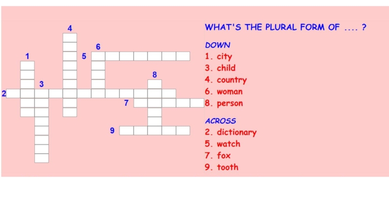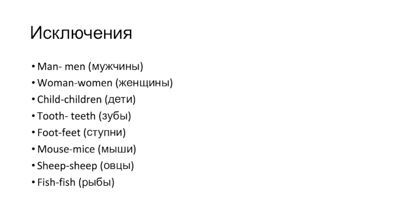 ИсключенияMan- men (мужчины)Woman-women (женщины)Child-children (дети)Tooth- teeth (зубы)Foot-feet (ступни)Mouse-mice (мыши)Sheep-sheep (овцы)Fish-fish (рыбы)