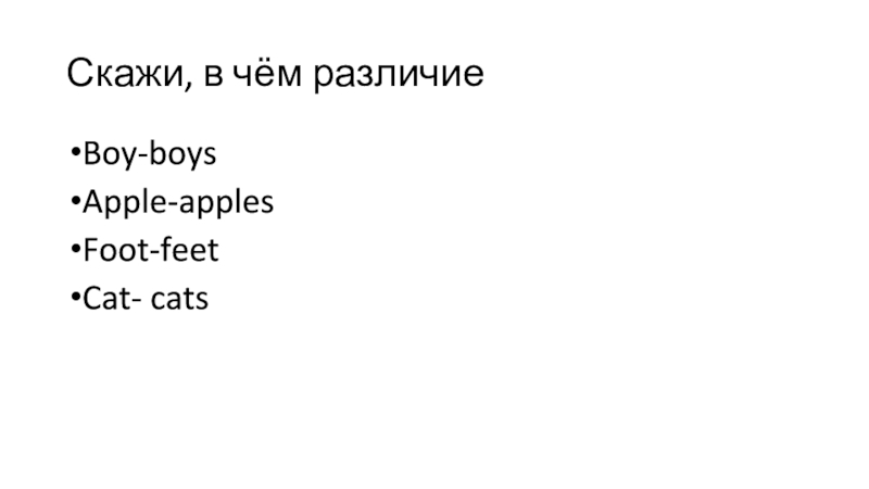 Скажи, в чём различиеBoy-boysApple-applesFoot-feetCat- cats