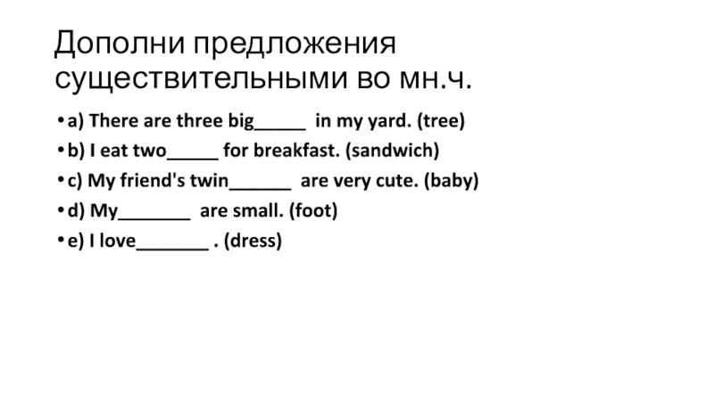 Дополни предложения существительными во мн.ч.a) There are three big_____  in my yard. (tree)b) I eat two_____ for breakfast. (sandwich)c)