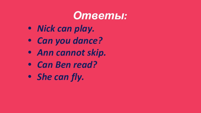 Ответы:Nick can play.Can you dance?Ann cannot skip.Can Ben read?She can fly.