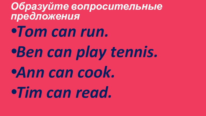 Образуйте вопросительные предложения Tom can run.Ben can play tennis.Ann can cook.Tim can read.