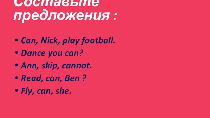 Составьте предложения :Can, Nick, play football.Dance you can?Ann, skip, cannot.Read, can, Ben ?Fly, can, she.