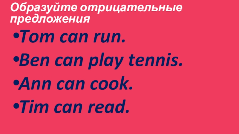 Образуйте отрицательные предложения Tom can run.Ben can play tennis.Ann can cook.Tim can read.