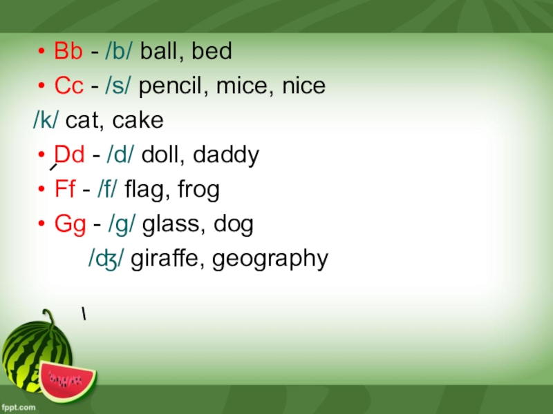 Bb - /b/ ball, bedCc - /s/ pencil, mice, nice/k/ cat, cakeDd - /d/ doll, daddyFf - /f/ flag, frogGg - /g/ glass, dog/ʤ/ giraffe, geography