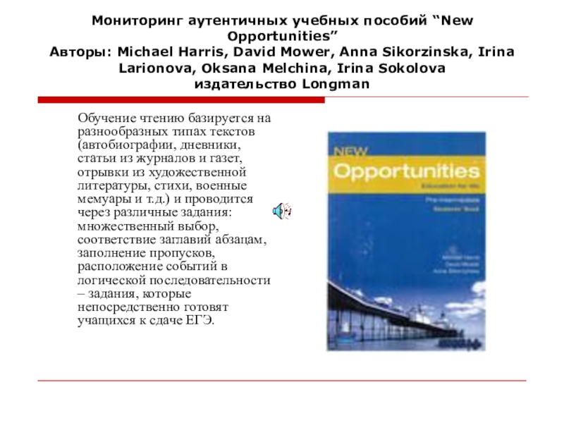 Обучение чтению базируется на разнообразных типах текстов (автобиографии, дневники, статьи из журналов и газет, отрывки из художественной литературы, стихи, военные мемуары и т.д.) и проводится через различные задания: множественный выбор, соответствие заглавий абзацам, заполнение пропусков, расположение событий в логической последовательности – задания, которые непосредственно готовят учащихся к сдаче ЕГЭ.