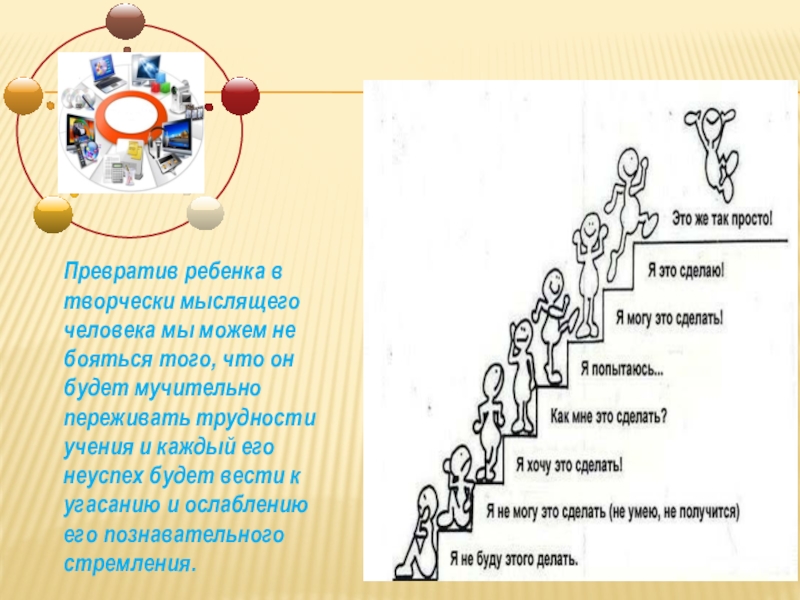 Превратив ребенка в творчески мыслящего человека мы можем не бояться того, что он будет мучительно переживать трудности учения и каждый его неуспех будет вести к угасанию и ослаблению его познавательного стремления.