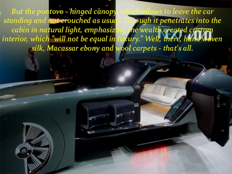 car standing and not crouched as usual. Through it penetrates into the cabin in natural light, emphasizing the wealth created custom interior, which "will not be equal in luxury." Well, there, hand woven silk, Macassar ebony and wool carpets - that's all.