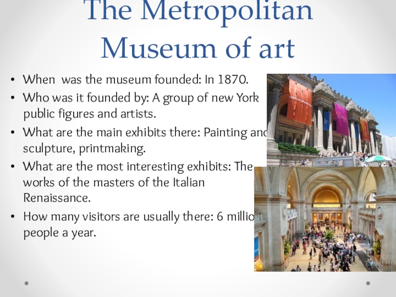 The Metropolitan Museum of artWhen was the museum founded: In 1870.Who was it founded by: A group of new York public figures and artists.What are the main exhibits there: Painting and sculpture, printmaking.What are the most