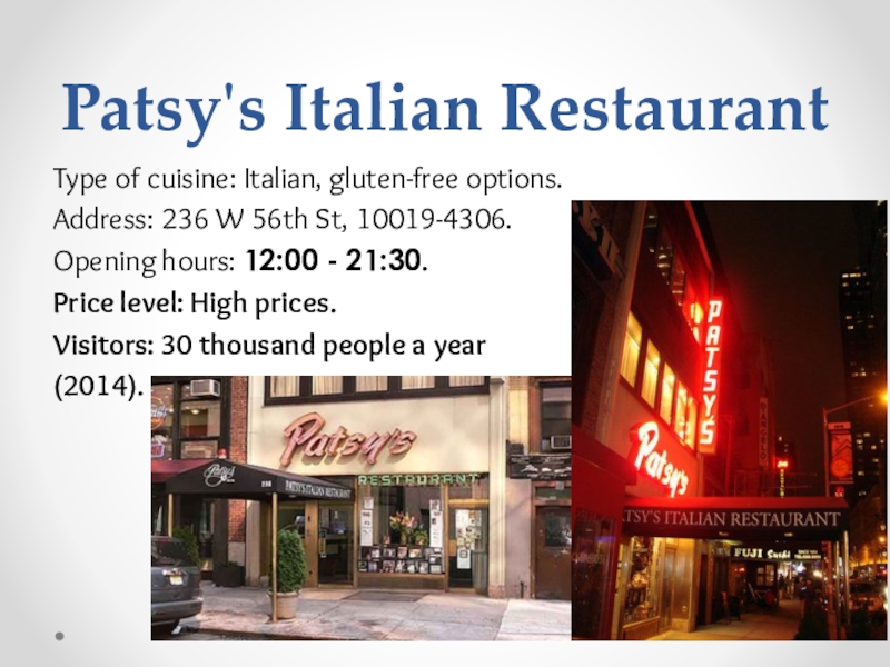 Patsy's Italian RestaurantType of cuisine: Italian, gluten-free options.Address: 236 W 56th St, 10019-4306.Opening hours: 12:00 - 21:30.Price level: High