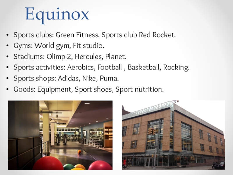 EquinoxSports clubs: Green Fitness, Sports club Red Rocket.Gyms: World gym, Fit studio.Stadiums: Olimp-2, Hercules, Planet.Sports activities: Aerobics,