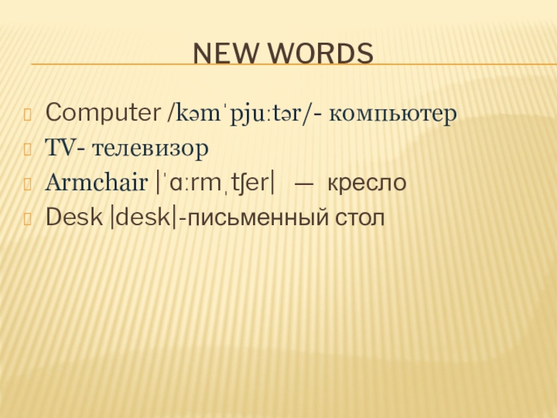 New wordsComputer /kəmˈpjuːtər/- компьютерTV- телевизорArmchair |ˈɑːrmˌtʃer|  — кресло Desk |desk|-письменный стол