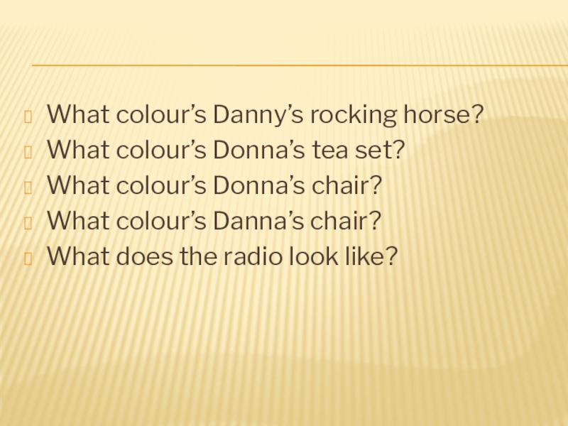 What colour’s Danny’s rocking horse?What colour’s Donna’s tea set?What colour’s Donna’s chair? What colour’s Danna’s chair?What does