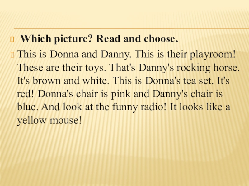 Which picture? Read and choose.This is Donna and Danny. This is their playroom! These are their toys.