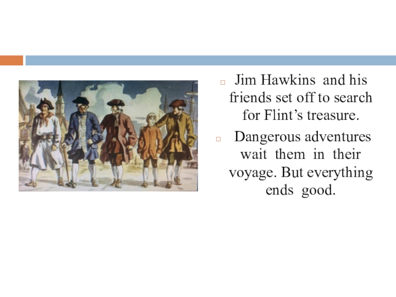 Слайд 13Jim Hawkins and his friends set off to search for Flint’s