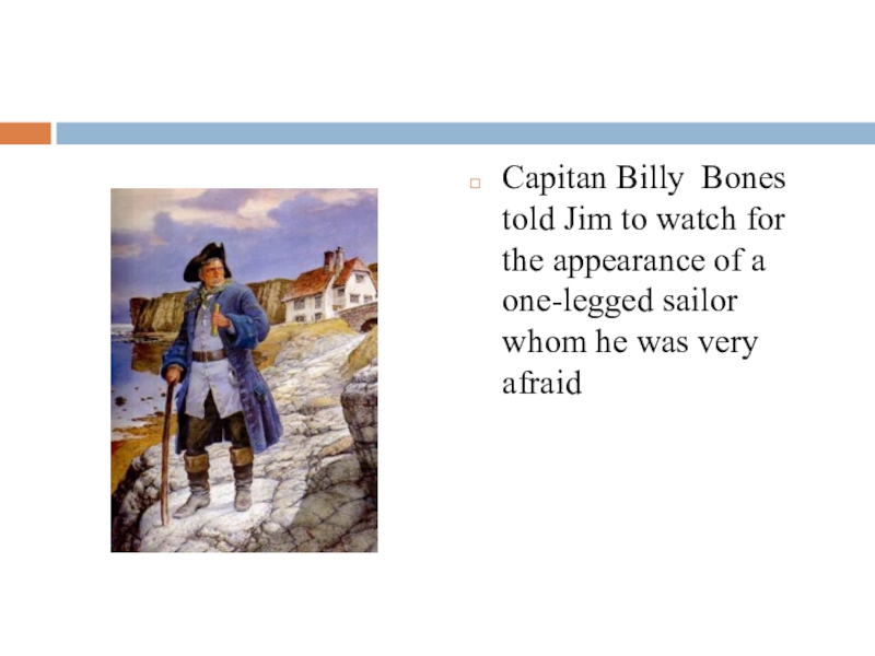 Слайд 8Capitan Billy Bones told Jim to watch for the appearance of