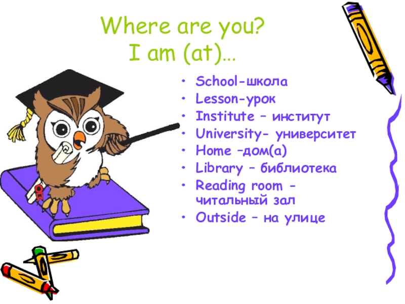 Where are you? I am (at)…School-школа Lesson-урокInstitute – институтUniversity- университетHome –дом(а)Library – библиотекаReading room - читальный залOutside