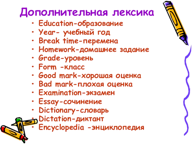 Дополнительная лексикаEducation-образованиеYear- учебный годBreak time-переменаHomework-домашнее заданиеGrade-уровеньForm -классGood mark-хорошая оценкаBad mark-плохая оценкаExamination-экзаменEssay-сочинениеDictionary-словарьDictation-диктантEncyclopedia -энциклопедия