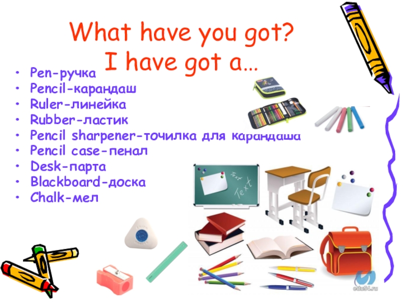 What have you got? I have got a…Pen-ручкаPencil-карандашRuler-линейкаRubber-ластикPencil sharpener-точилка для карандашаPencil case-пеналDesk-партаBlackboard-доскаChalk-мел