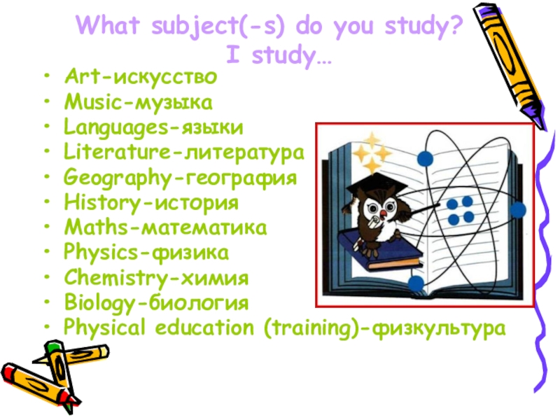What subject(-s) do you study?  I study…Art-искусствоMusic-музыкаLanguages-языкиLiterature-литератураGeography-географияHistory-историяMaths-математикаPhysics-физикаChemistry-химияBiology-биологияPhysical education (training)-физкультура