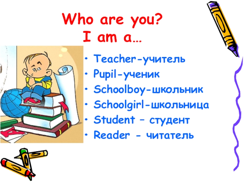 Who are you? I am a…Teacher-учительPupil-ученикSchoolboy-школьникSchoolgirl-школьницаStudent – студентReader - читатель