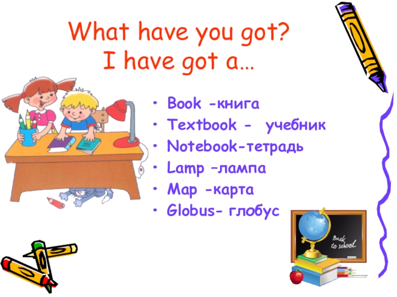 What have you got? I have got a…Book -книга Textbook - учебникNotebook-тетрадьLamp –лампаMap -карта Globus- глобус