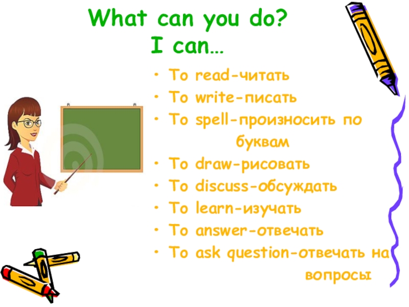 What can you do? I can… To read-читатьTo write-писатьTo spell-произносить по