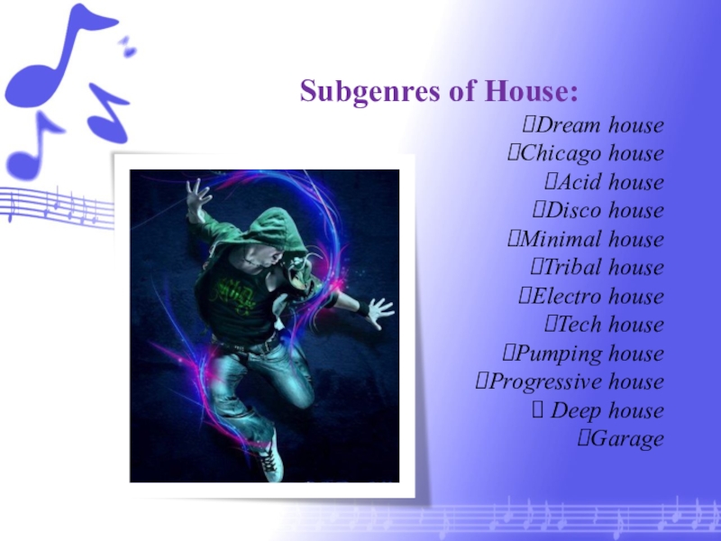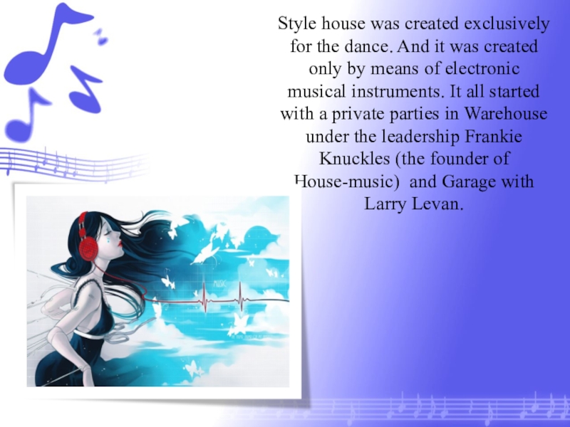 created only by means of electronic musical instruments. It all started with a private parties in Warehouse under the leadership Frankie Knuckles (the founder of House-music) and Garage with Larry Levan.