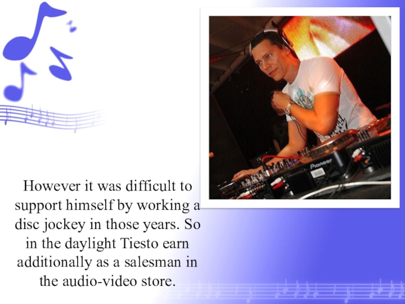 jockey in those years. So in the daylight Tiesto earn additionally as a salesman in the audio-video store.