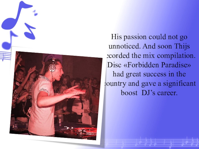 Слайд 15His passion could not go unnoticed. And soon Thijs recorded the