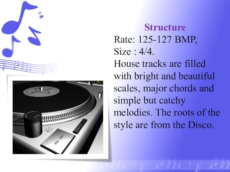 House tracks are filled with bright and beautiful scales, major chords and simple but catchy melodies. The roots of the style are from the Disco.