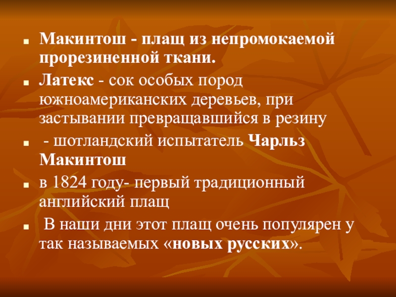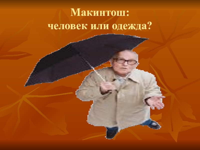 Слайд 10Макинтош - плащ из непромокаемой прорезиненной ткани.