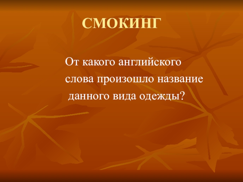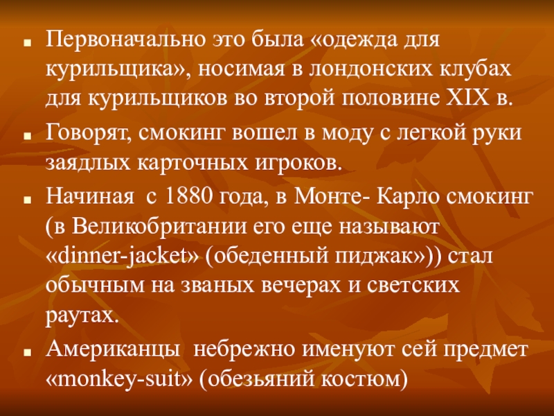 Слайд 31Первоначально это была «одежда для курильщика», носимая в лондонских клубах для