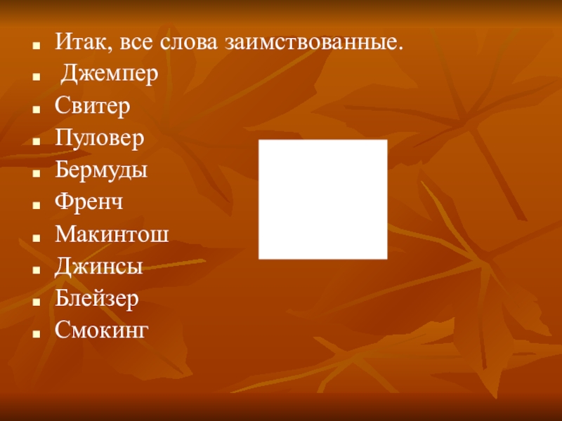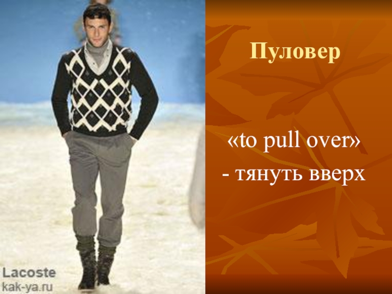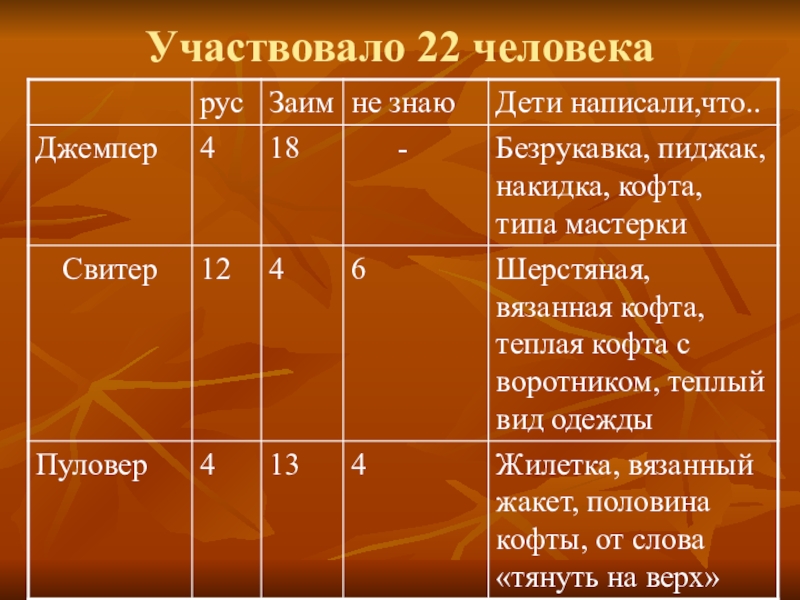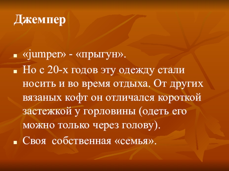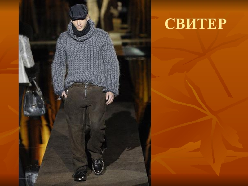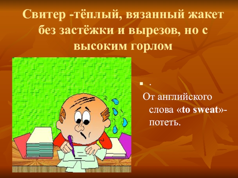 Слайд 21Свитер -тёплый, вязанный жакет без застёжки и вырезов, но с высоким