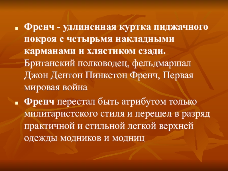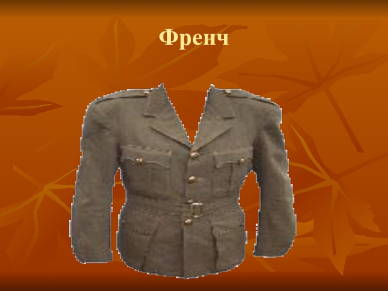 Слайд 14Френч - удлиненная куртка пиджачного покроя с четырьмя накладными карманами и