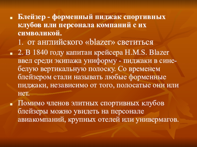 Слайд 12Блейзер - форменный пиджак спортивных клубов или персонала компаний с их