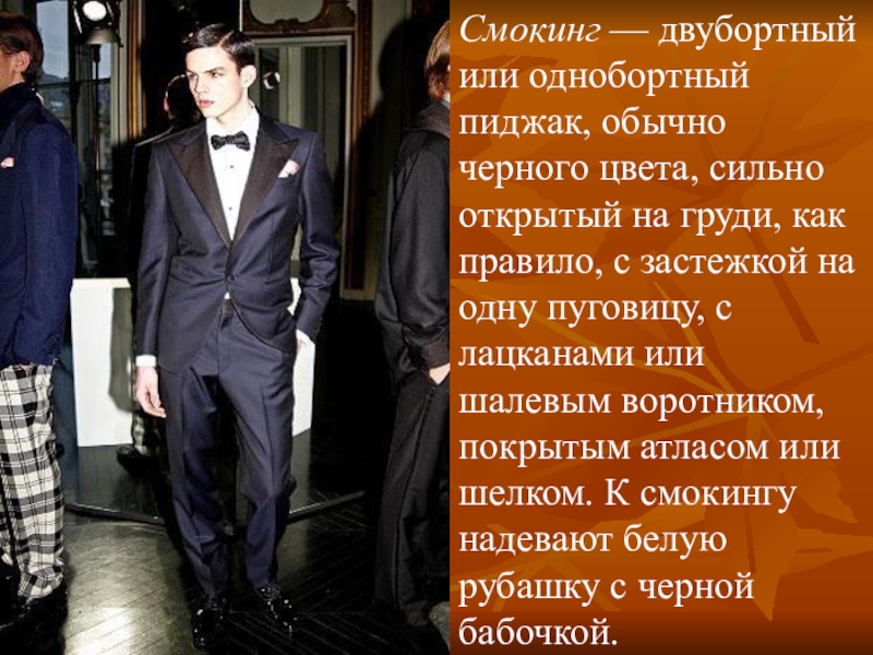 Смокинг — двубортный или однобортный пиджак, обычно черного цвета, сильно открытый